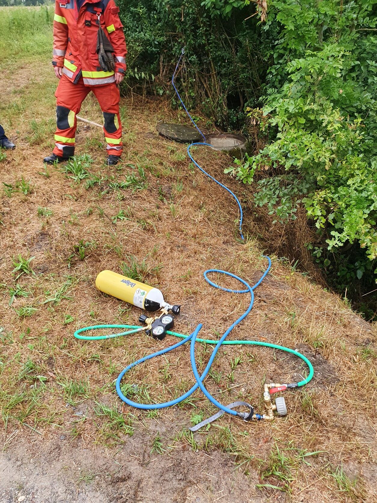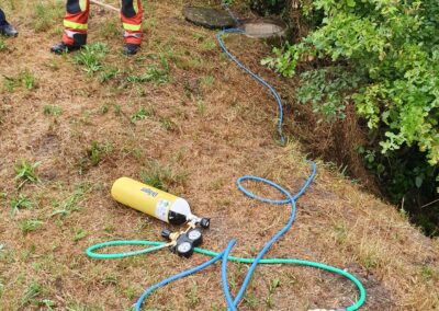 Damit der Sachverhalt und das auslaufende Medium genauer bestimmt werden kann, musste die Feuerwehr FWMS in einer Sofortmassnahme das Rohr, mit Hilfe eines Kanaldichtkissens, abdichten.