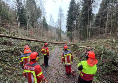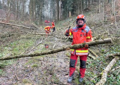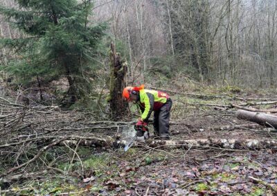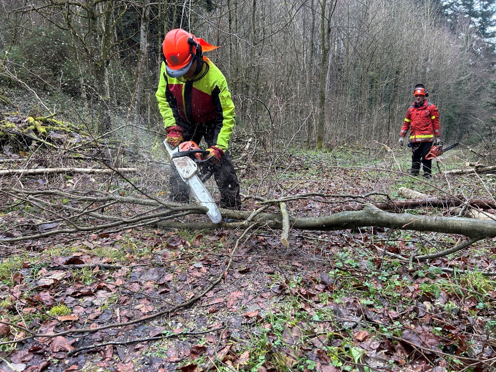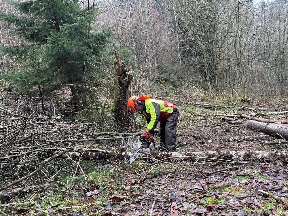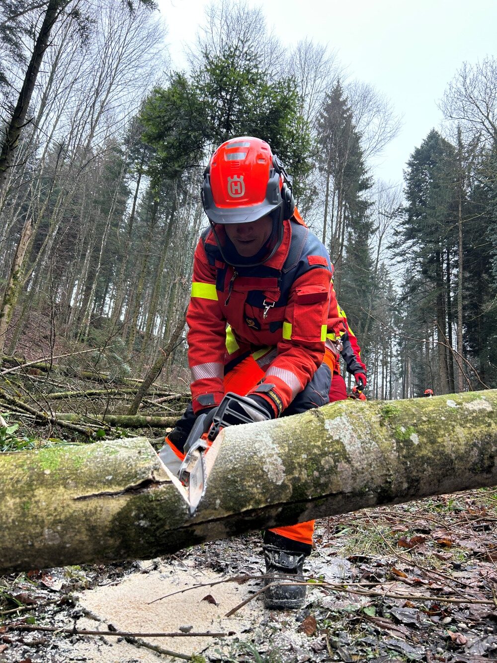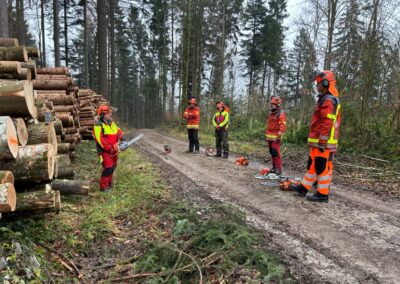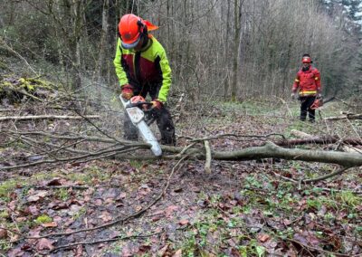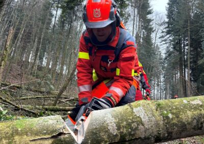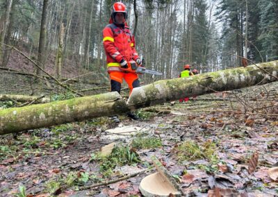 Unter fachkundiger Anleitung wurde der Umgang mit der Motorsäge geschult und das richtige Einschätzen von besonderen Lagen bei Sturmholz ausgebildet.